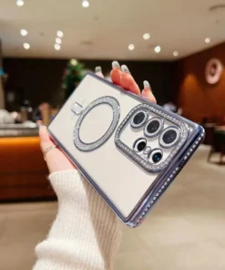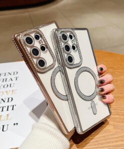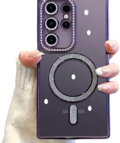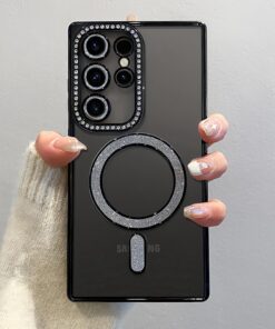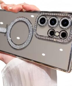 Samsung Galaxy S23/S24/S25 Ultra Magnetic Case with Glitter Diamond Camera Protector, Luxury Plating Bling Rhinestones Soft Bumper Clear Transparent Phone Case