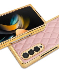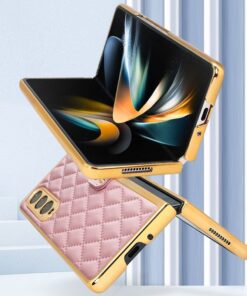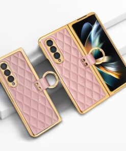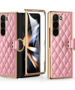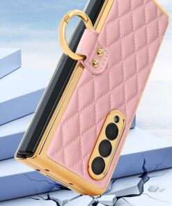 Samsung Galaxy Z Fold 3 4 5 6 Series, Luxury Plating Edge Case with Hanging Ring Anti-Scratch Screen Protection Leather Cover